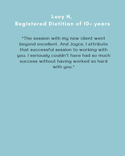 In addition to mentoring practitioners, Joyce runs her private practice, Joyceful Nutrition, where she supports clients through a culturally inclusive and weight-inclusive approach. She helps individuals build a healthier relationship with food, navigate life transitions, and create sustainable nutrition habits that align with their personal values and health goals.