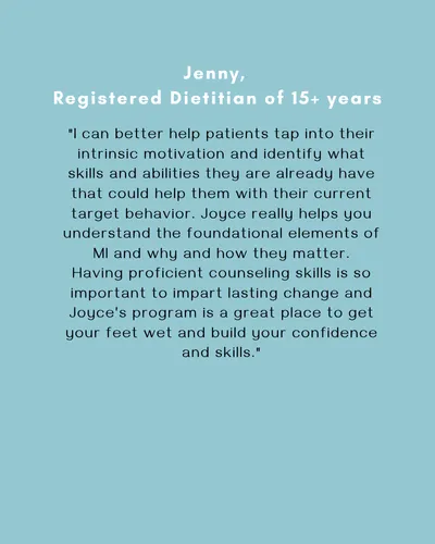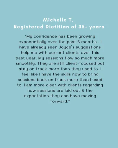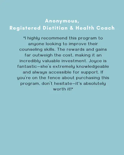 Joyce is a nutrition counseling coach with a passion for empowering fellow dietitians and nutrition professionals to enhance their coaching and counseling skills, equipping them to better support and retain their clients while promoting lasting behavior change. With a Ph.D. in Nutrition and Mental Health, years as a tenure-track professor, and former nutrition program manager at a clinic, she brings a wealth of knowledge and experience to everything she does. She was recently admitted to the Motivational Interviewing Network of Trainers (MINT).