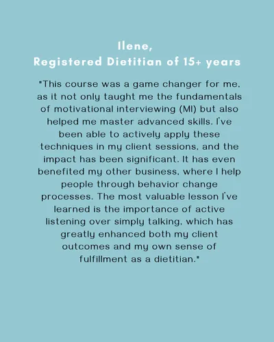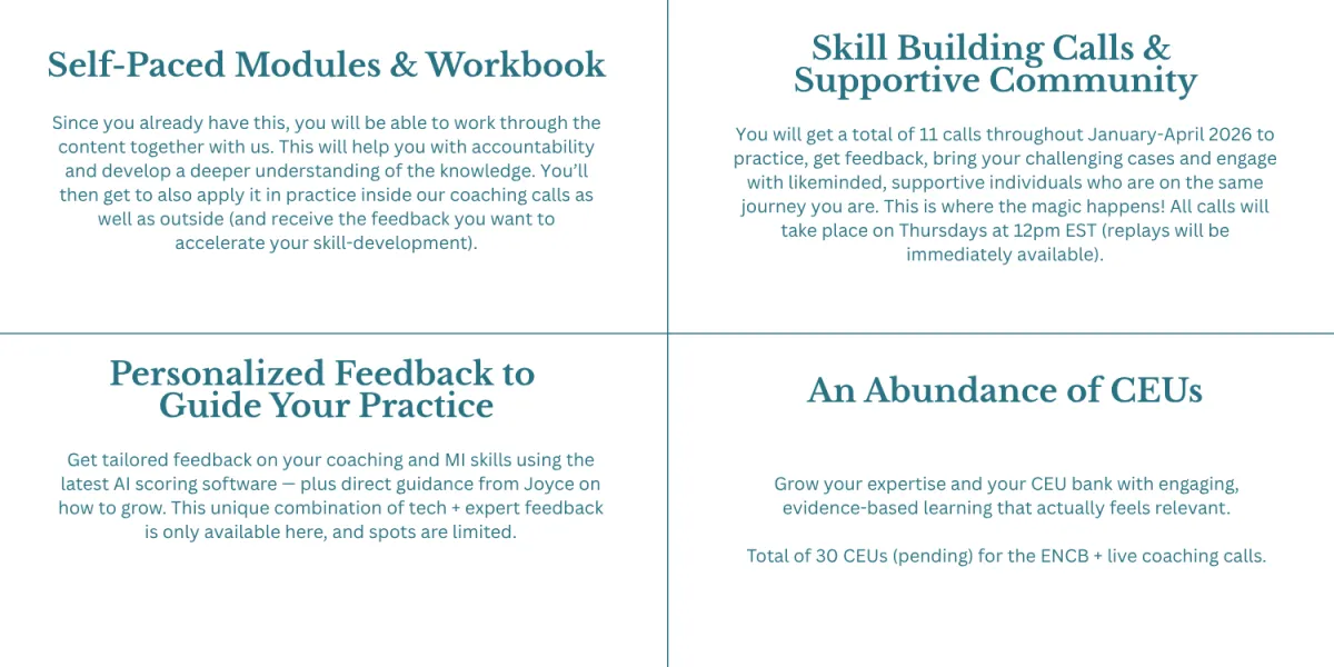 You'll have a clear structure for your sessions using foundations of MI and behavior change psychology- without sounding robotic because you'll have many opportunities to practice with support and receive guidance.