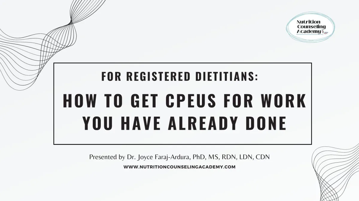 Hi there! I'm Joyce Faraj-Ardura, CEO of The Nutrition Counseling Academy. As a registered dietitian (RD) with a passion for helping people, I've discovered that many RDs like yourself, might be scrambling for CEUs last minute. And how nice would it be if the work we do to increase our expertise - like giving presentations - would actually count? Well, CDR has made updates as of Sumer 2024, and now there's a new way for you to get up to 15 CEUs!